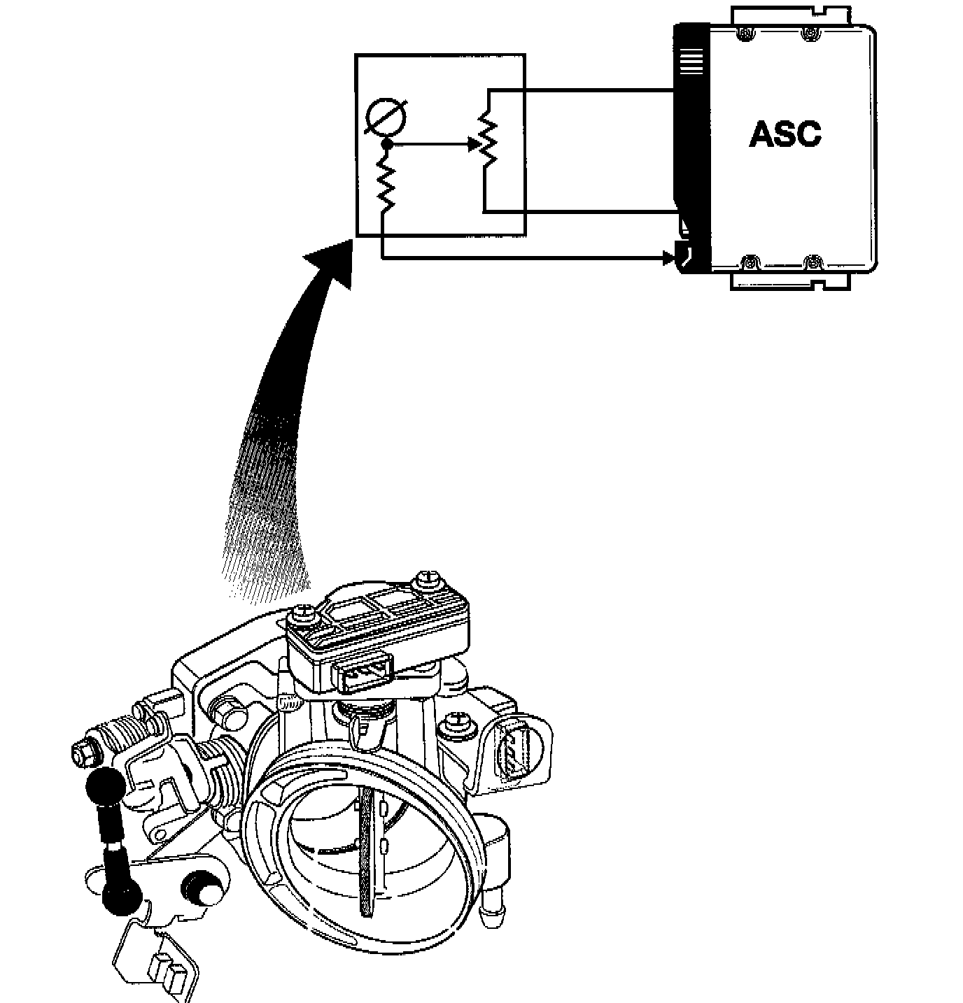 The throttle position sensor is mounted on the auxiliary throttle valve (ADS II) actuator. The ASC control module monitors the signal from the position sensor for ADS II position and verification of system operation. The sensor receives power and ground from the ASC control module (5 volts) and provides a varying voltage signal back to the ASC control module as to the throttle valve's position