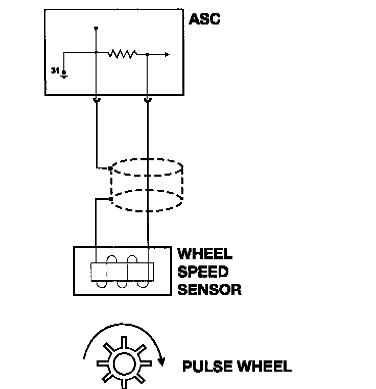 As the impulse wheel rotates, each tooth of the wheel that passes the sensor causes an AC voltage to be produced by the sensor. The ASC (+T) control unit interprets the wheel speed from the number of pulses per second produced by the AC voltage.