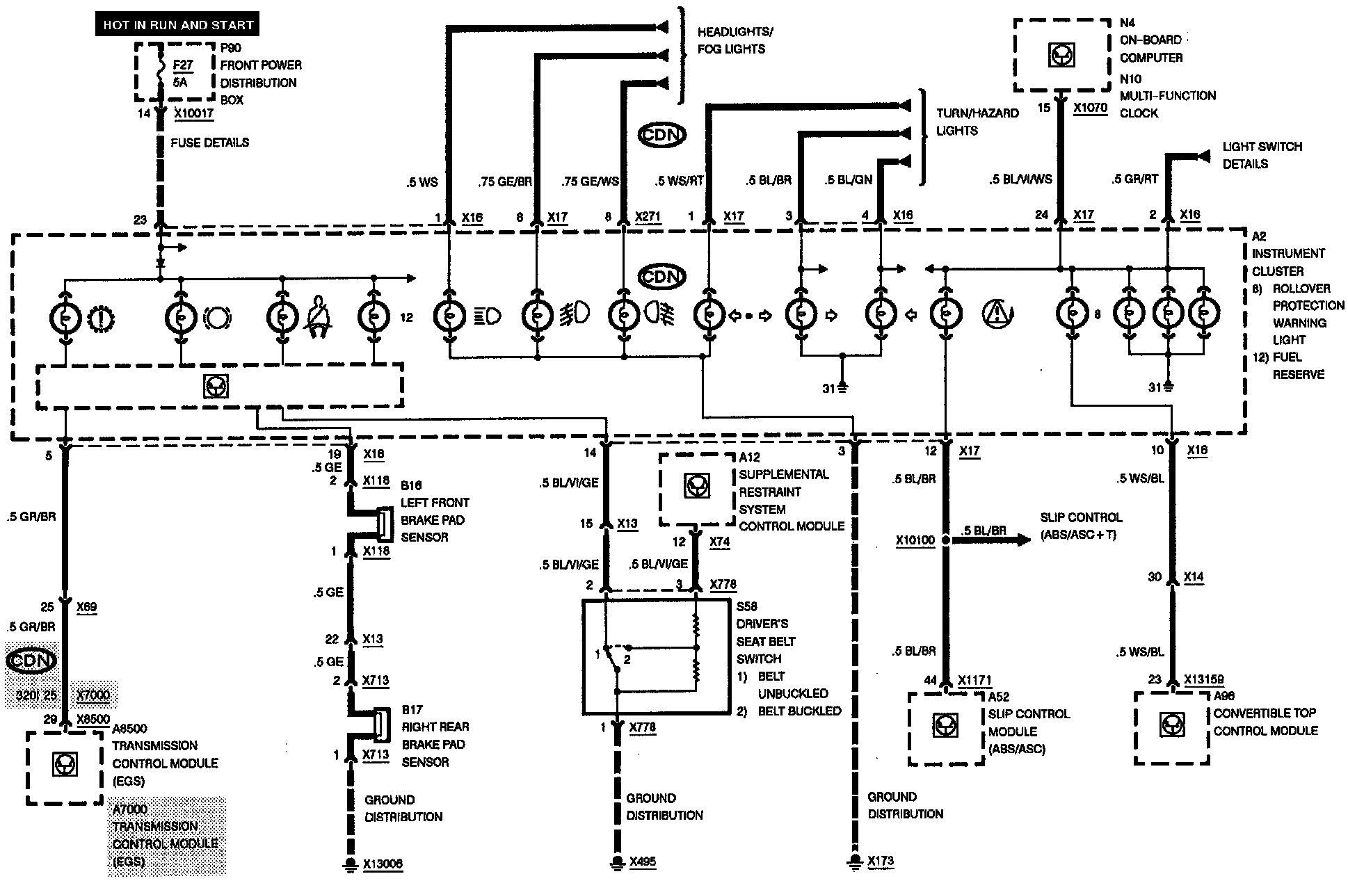 No volts: check for voltage at I/P connector X16, pin 19. If OK check for an open circuit between I/P connector X16, pin 19, and front brake sensor connector X118, pin 2.