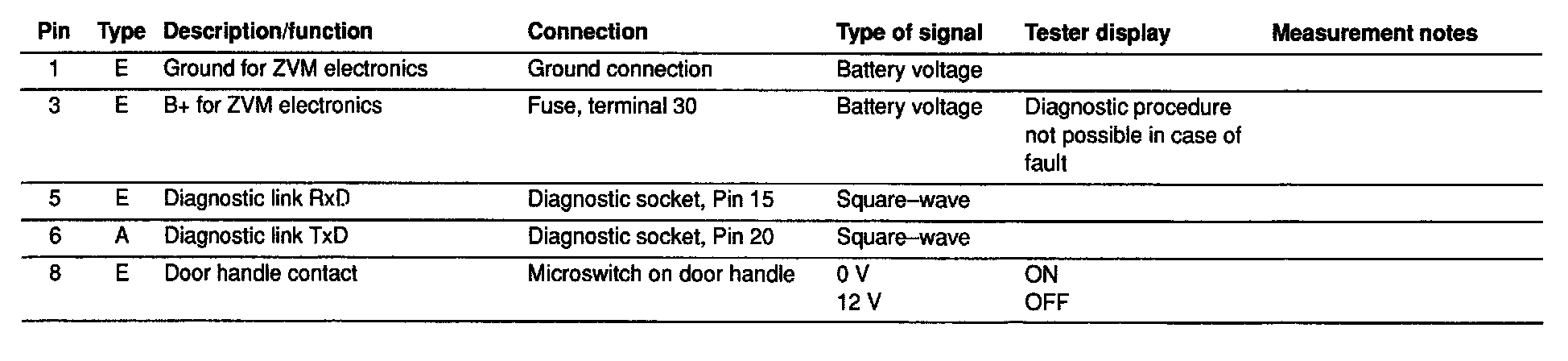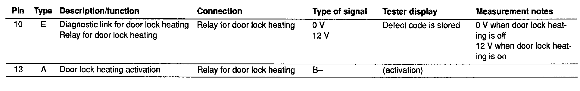 Pin assignments at ZVM connector C, X 13012, in vicinity of door lock heating