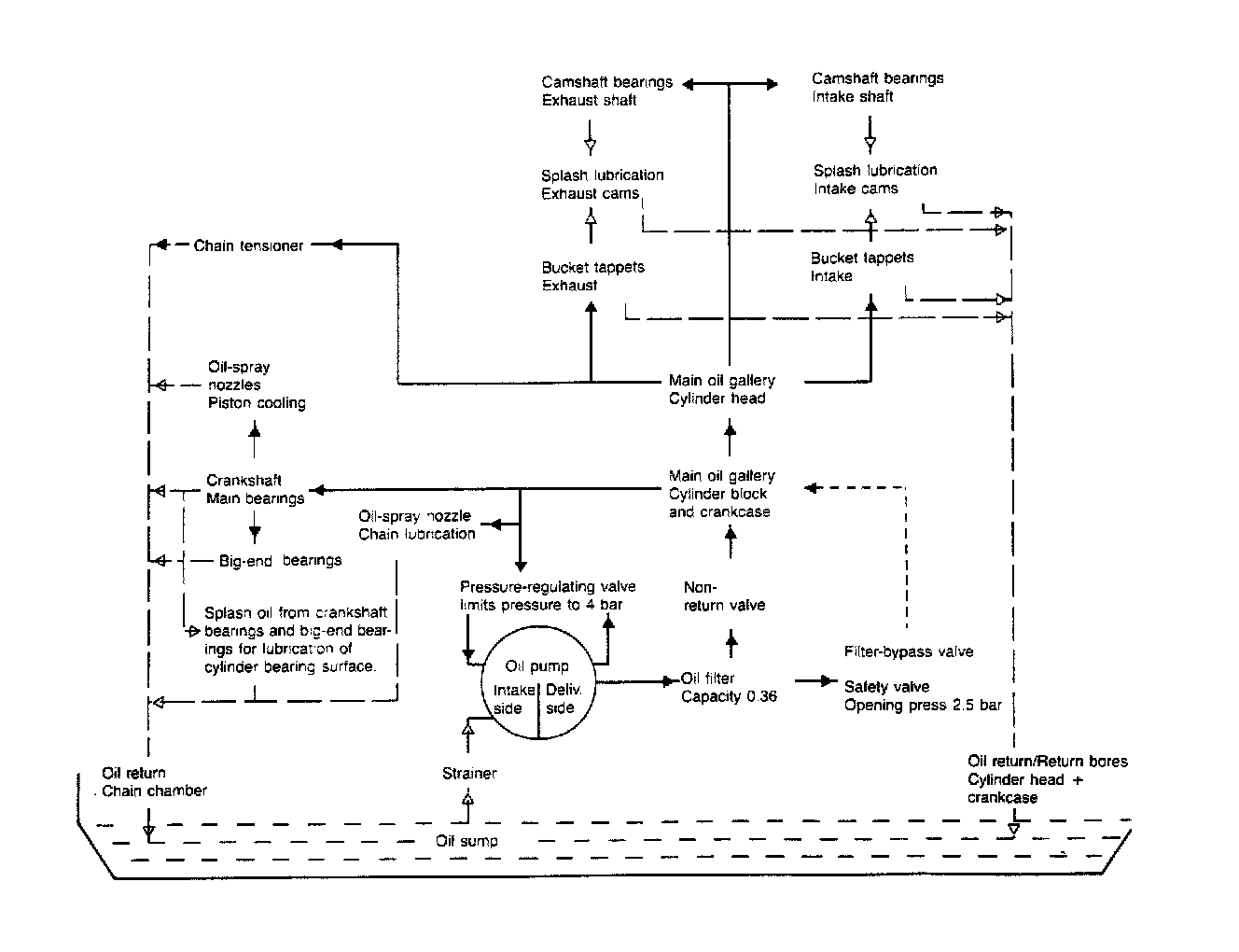 The cam bearing surfaces are lubricated by oil bores in the camshaft bearings and in the bucket tappets.
