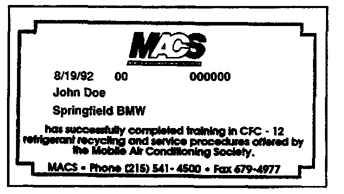 Technicians using approved equipment must be trained and certified by an EPA-approved organization, such as your BMW training center. To be certified, technicians must pass a test demonstrating their knowledge in the use of recycling equipment in compliance with SAE Standard J1989, the regulatory requirements, the importance of refrigerant containment, and the effects of ozone depletion.