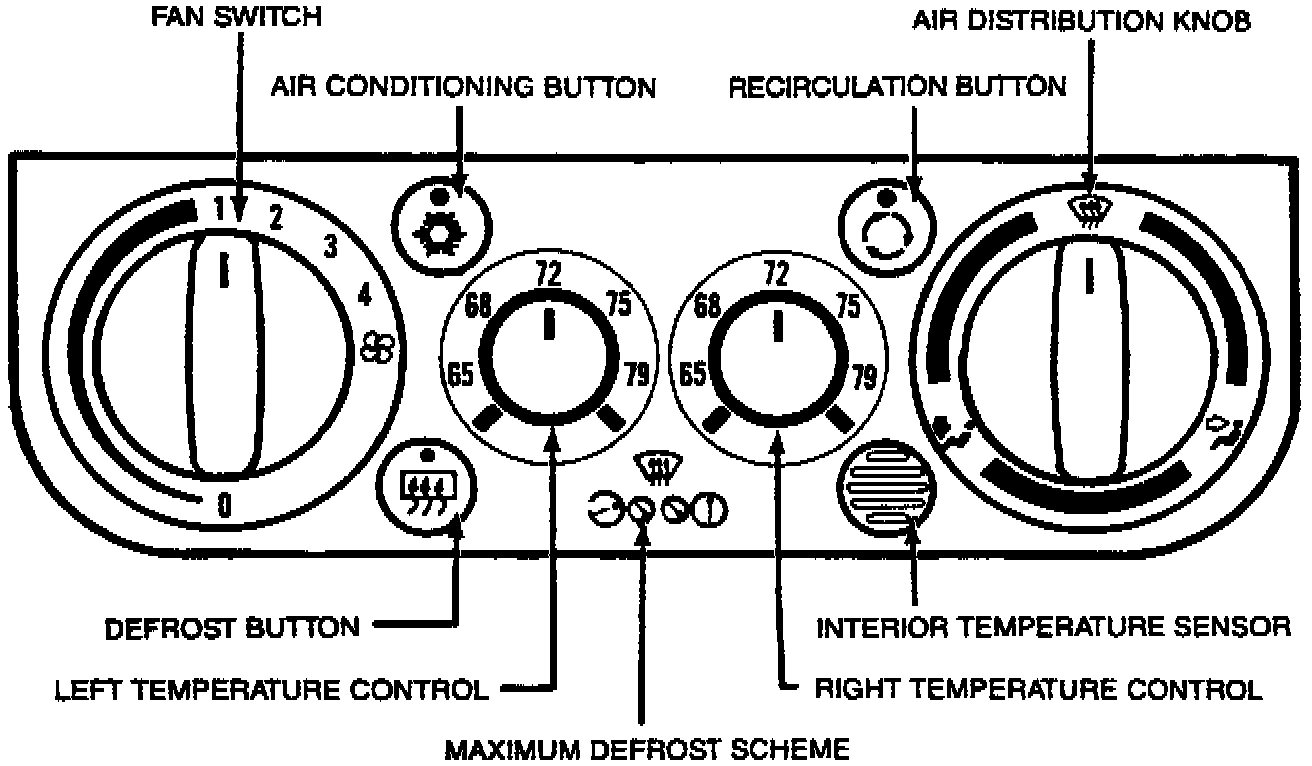 A compact control panel, located in the center dash below the radio, contains all the heater and air conditioner control switches.