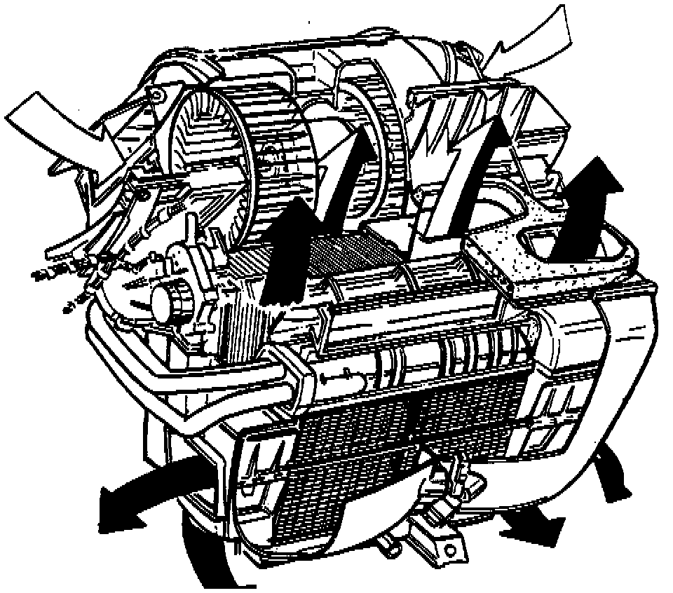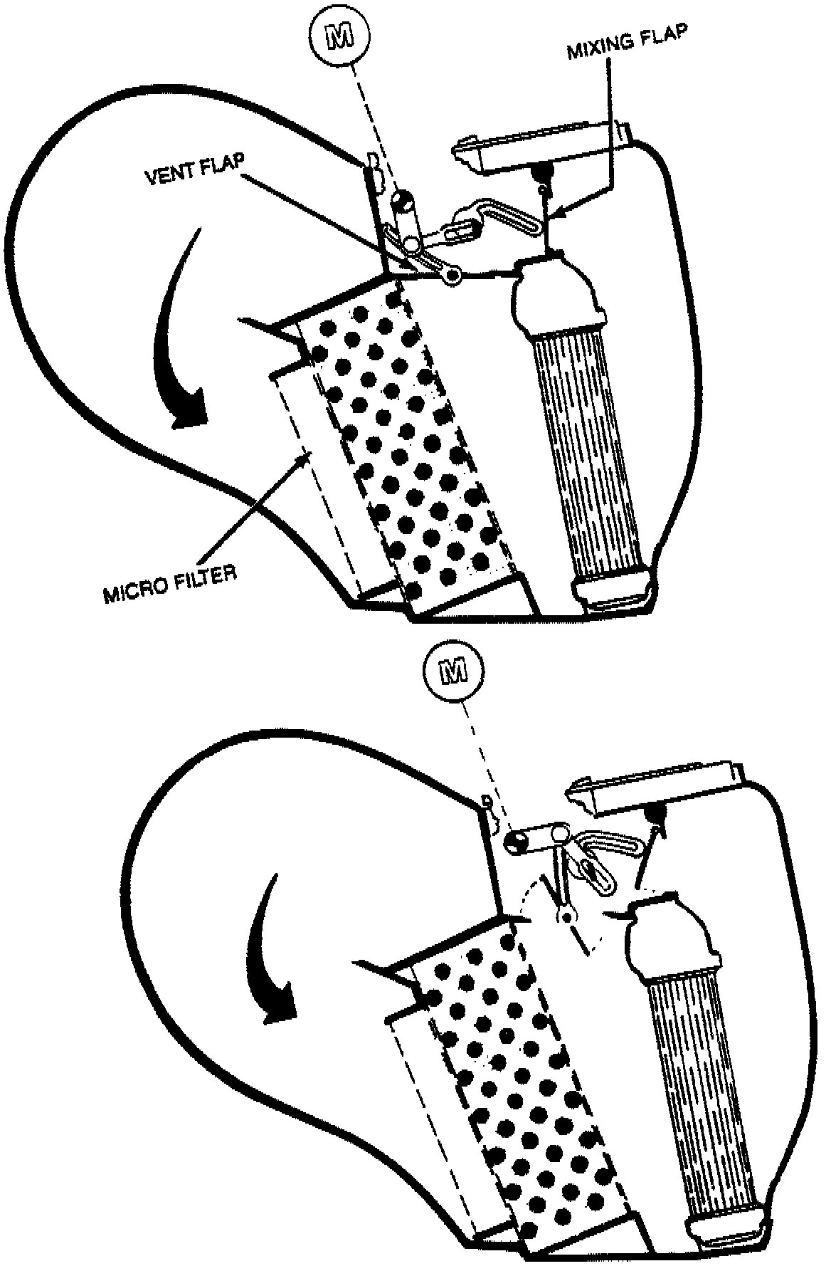 Flap operation is controlled by a bowden cable and three stepper motors. The bowden cable controls the footwell flaps and the defrost flaps. Stepper motors control the fresh air and recirculation flaps. The third stepper motor controls the vent (face level) flaps and mixing flap via a linkage connecting the two.