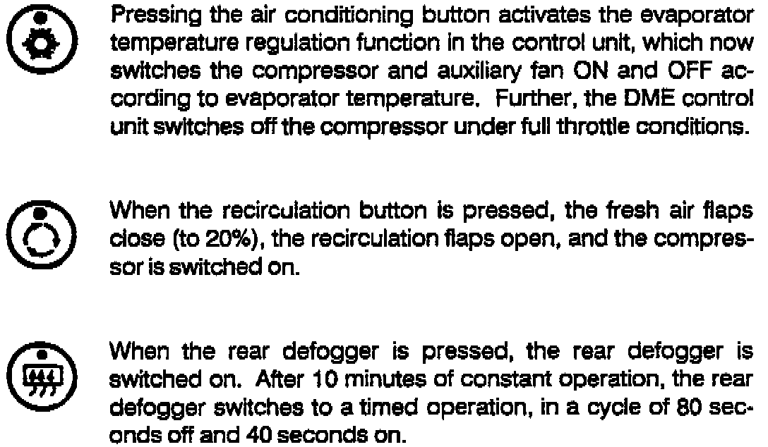 A new version of the IHKR heating/air conditioning system has been developed for the E36. Designated IHKR-E36, it shares features with the IHKR systems found in E34 vehicles, such as separate left and right temperature regulation, but incorporates several new features.