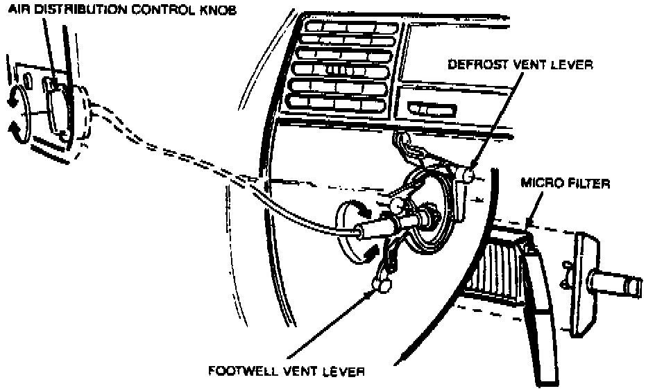 The footwell, vent (face level) and defrost flaps are controlled with the rotary distribution knob. The knob can be rotated through 360° in either direction. Positioning the knob between any of the detents produces a blending of air distribution to the outlets on either side of the knob index.