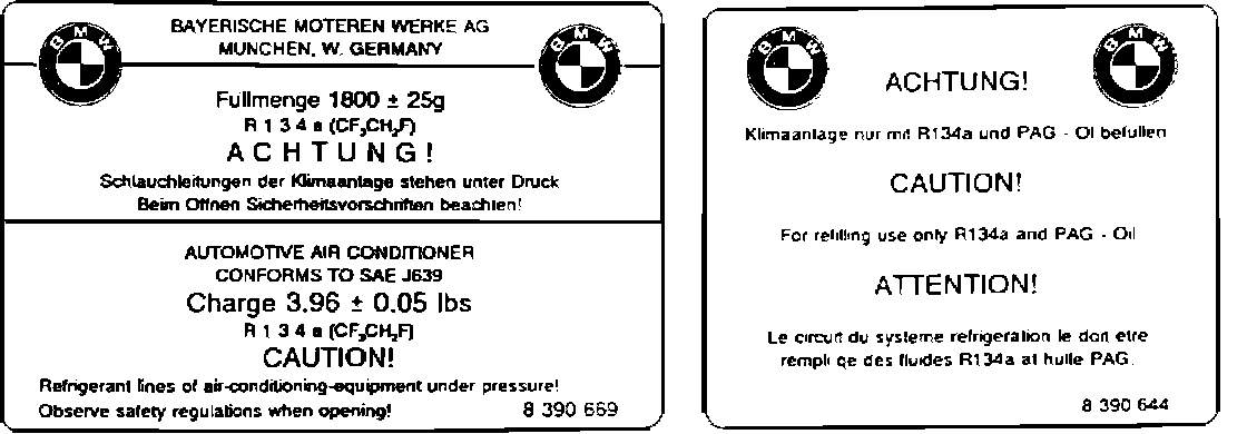 The compressor oil used in the R-134a system is drastically different than the mineral oil based lubricant used in R-12 systems. R-134a systems require Polyalkylene Gycol lubricants, often referred to as "PAG" oil. The proper PAG oil for use in BMW R-134a systems will be made available through normal parts channels. Use of R-12 compressor oil in R-134a systems will cause the compressor to seize and fail. The R-12 mineral oil does not stay in solution in R-12a. In addition, R-134a compressor PAG oil should not be used in an R-12 system. Long term damage and corrosion will result. The green R-134a system labels, usually located near the top side of the fan shroud in the engine compartment, will display the refrigerant/PAG oil requirement for R-134a systems. R-12 systems will have a BLACK sticker located in a similiar place. Examples are illustrated.