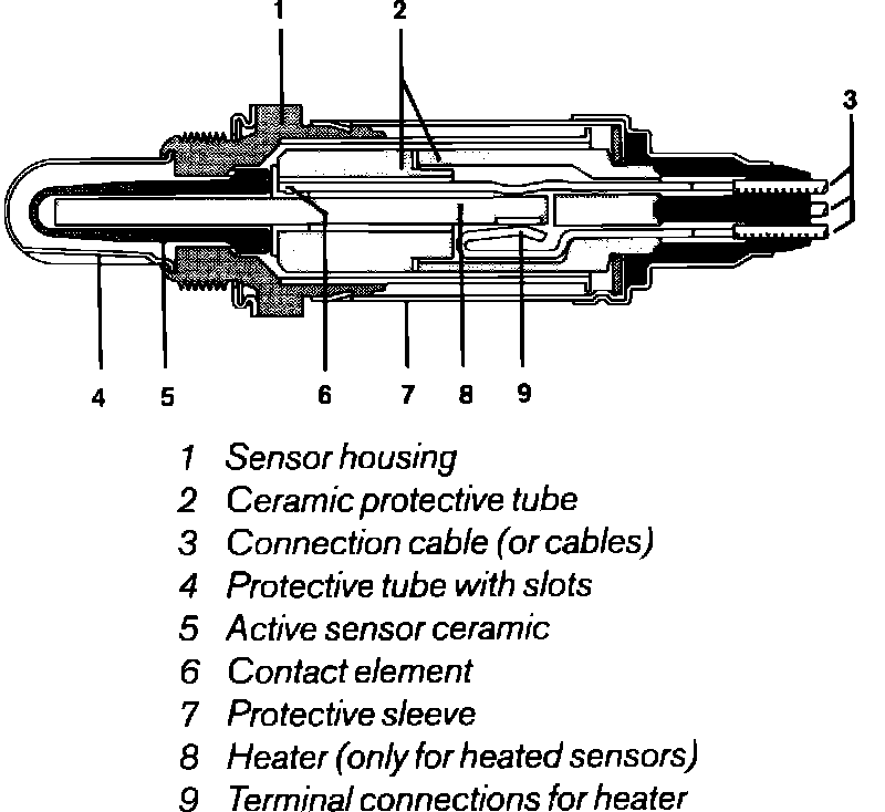The oxygen sensor is installed in the exhaust manifold where it monitors the oxygen content of the exhaust gas. The sensor has a hollow Zirconia element with a Platinum coating on its inside and outside surfaces. The open end of the element is exposed to the atmosphere and its surface is connected to the ECU, while the closed end protrudes into the exhaust stream and its surface is connected to ground.