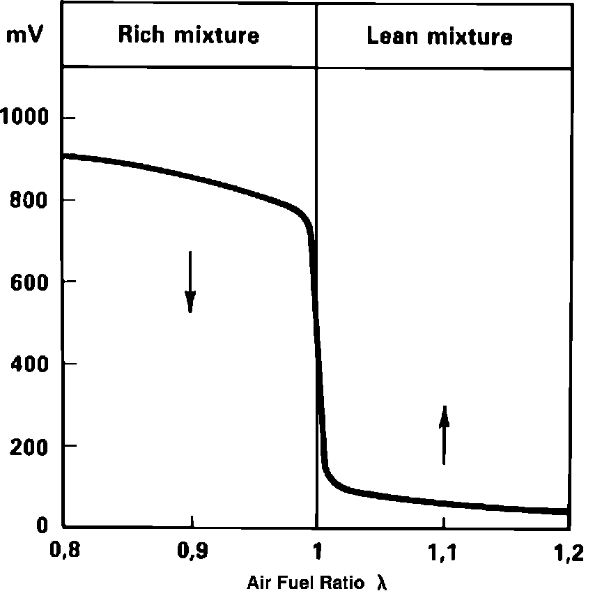 The ECU measures this voltage, determines the concentration of Oxygen in the exhaust, and adjusts the air/fuel ratio accordingly. Therefore, a low voltage (300 millivolts or less) indicates a high concentration of Oxygen in the exhaust gas (lean air/fuel ratio) and the ECU commands the fuel system to meter additional fuel into the engine (rich command). A high voltage (600 millivolts or more) indicates a low concentration of Oxygen in the exhaust (rich air/fuel ratio) and the ECU commands the fuel system to reduce the amount of fuel delivered to the engine (lean command).