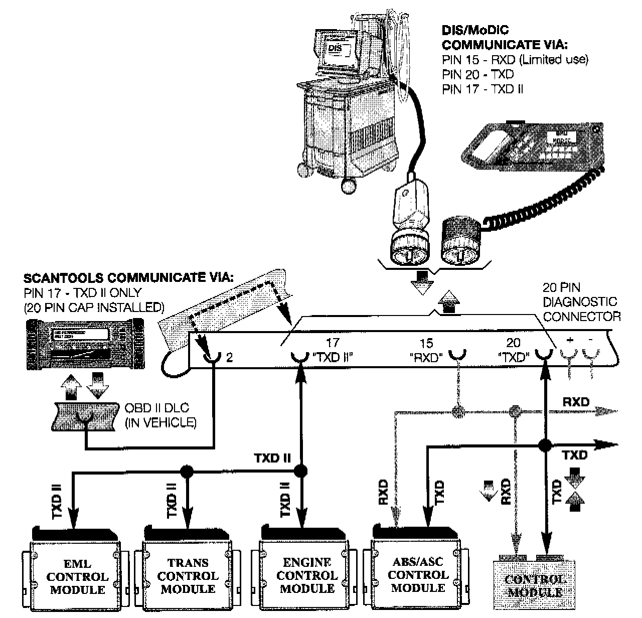 TXD II (pin 17) was added to the 20 pin [1][2]diagnostic connector to provide a separate connection to Drivetrain control modules (DME, AGS, EML) for OBD II compliance. The separate connection is for security reasons. The DIS/MoDiC share the same TXD II wire though the Scantool and DIS/MoDiC communicate with different "languages".