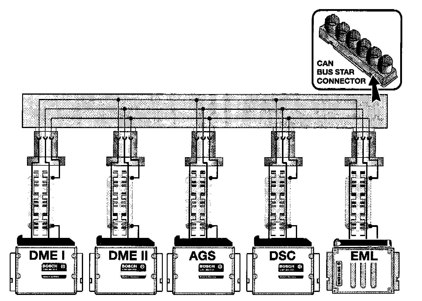 The Star connector continues to be used for the 75OiL but wiring layout (topology) was changed to improve communication integrity in the event of a break or short in another section of the CAN bus. This was accomplished by using the DME control modules as gateways for the EML and AGS control modules.