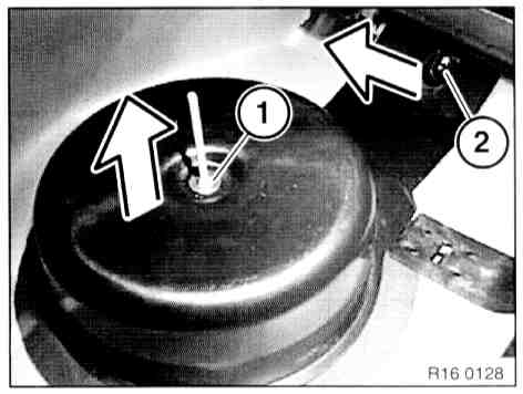 - Remove luggage compartment mat and spare wheel.- Unfasten hexagon nut (1) and plastic nut (2). Take off cover for activated carbon canister upward.