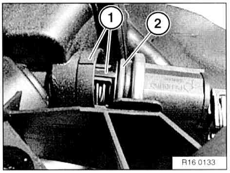 - Press detent (2) to side and pull activated carbon canister non-return valve (3) out of activated carbon canister.