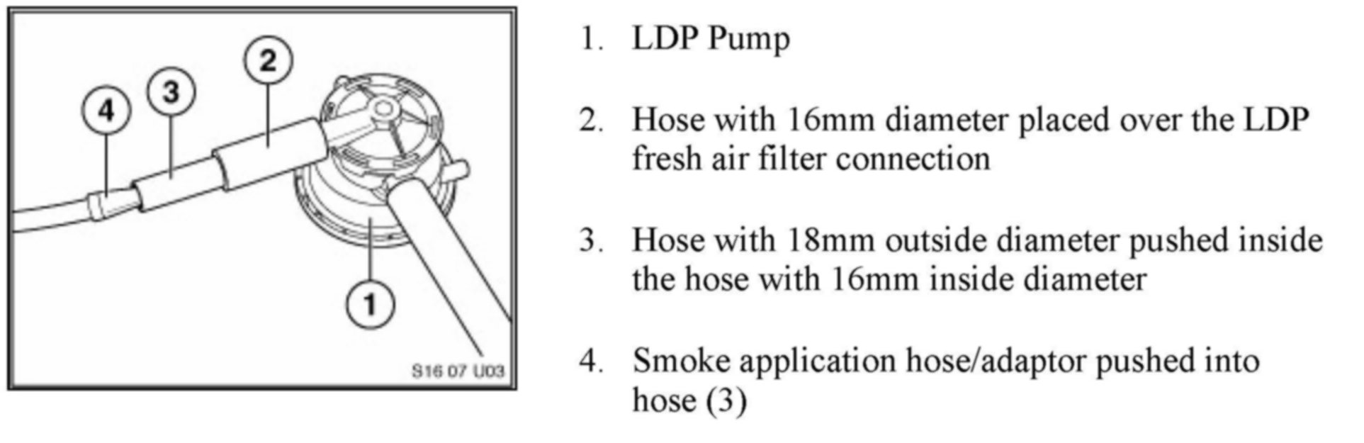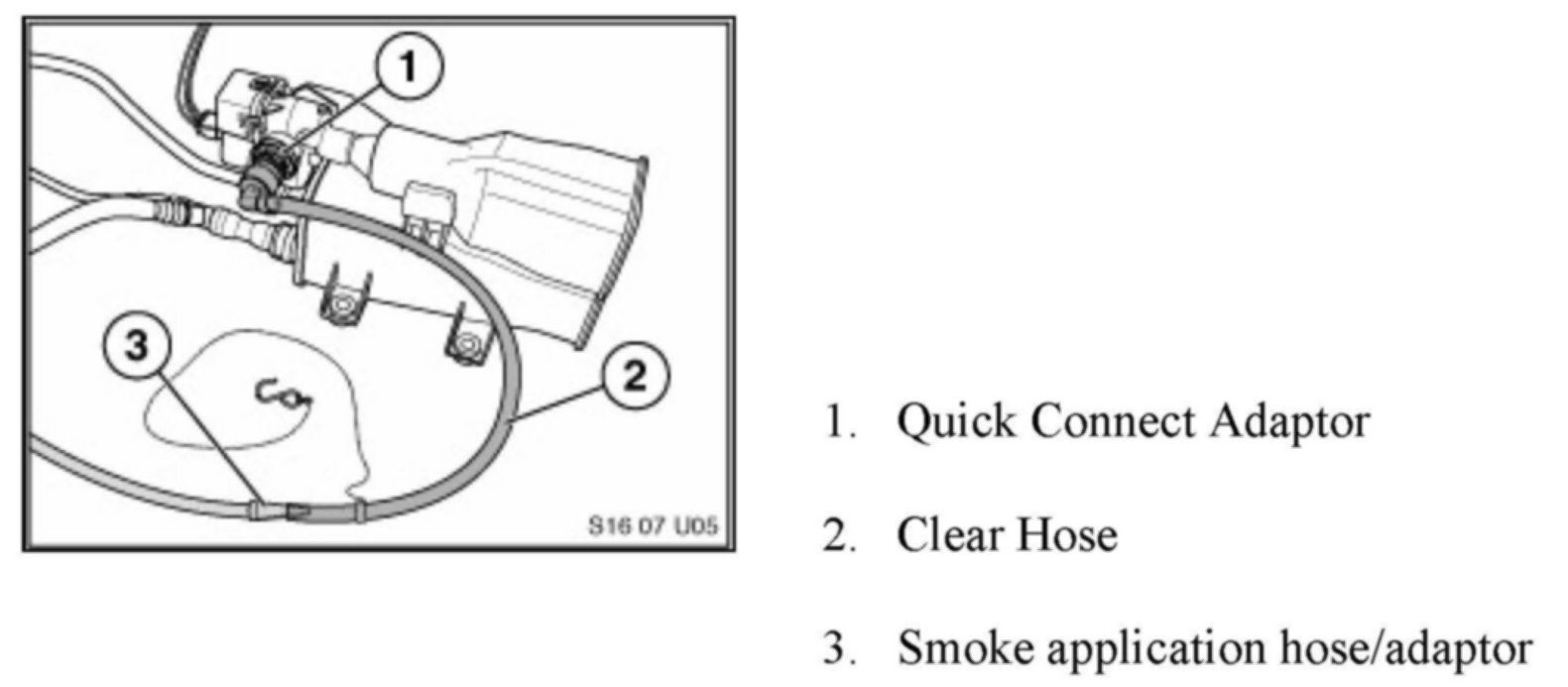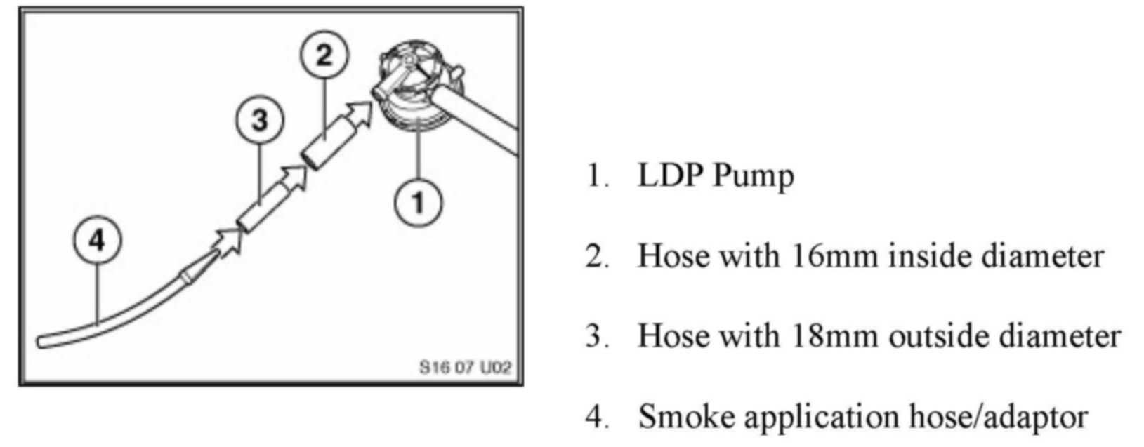 Vehicles equipped with the LDP system will require a series of small pieces of rubber hose to adapt the smoke machine application hose.