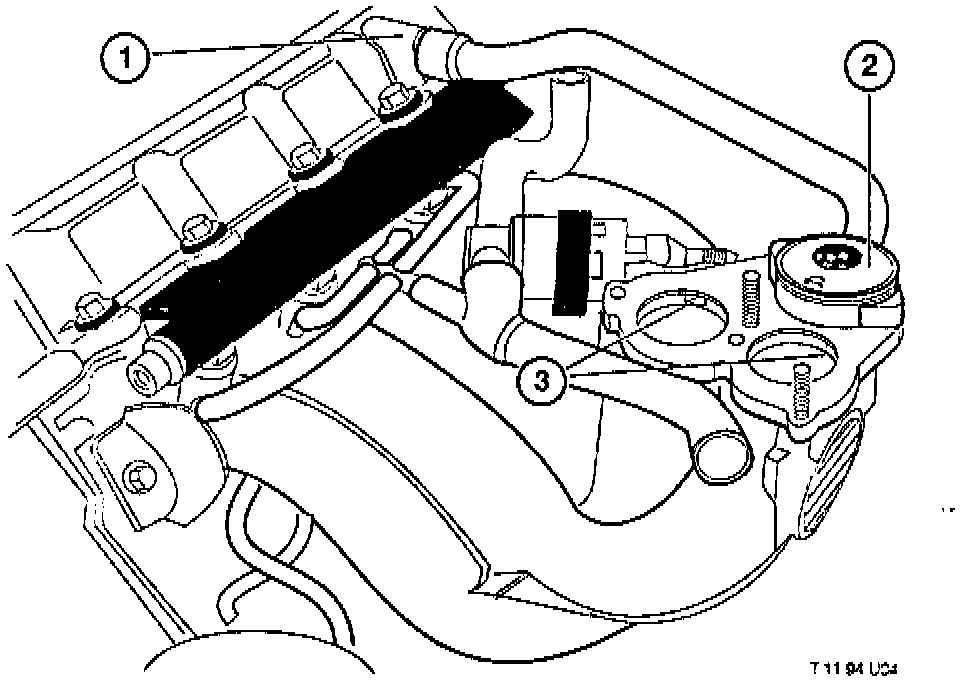 The crankcase is ventilated by a pressure controlled system. The oil vapors from the crankcase enter a labyrinth/oil trap which is integrated into the cylinder head cover (1). Here liquid oil is separated out, returned into the cylinder head and eventually the sump. The remaining vapors are drawn into the intake manifold (3) via a pressure control valve (2).