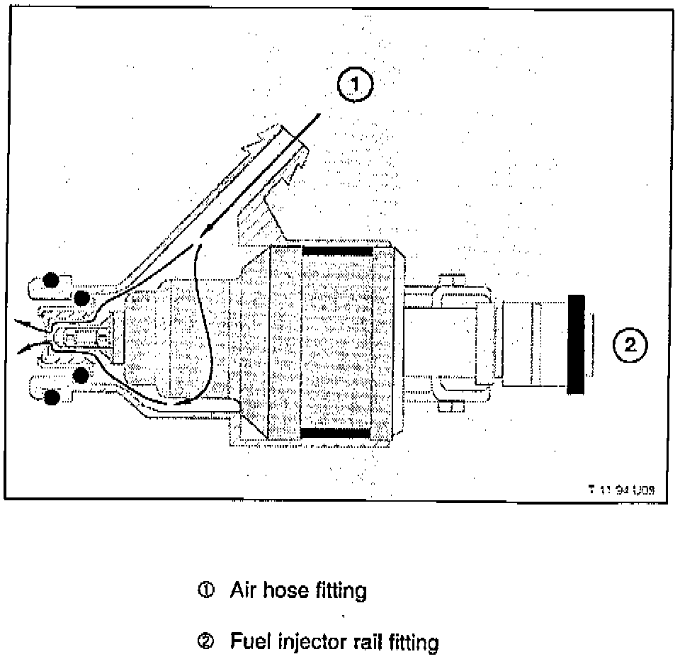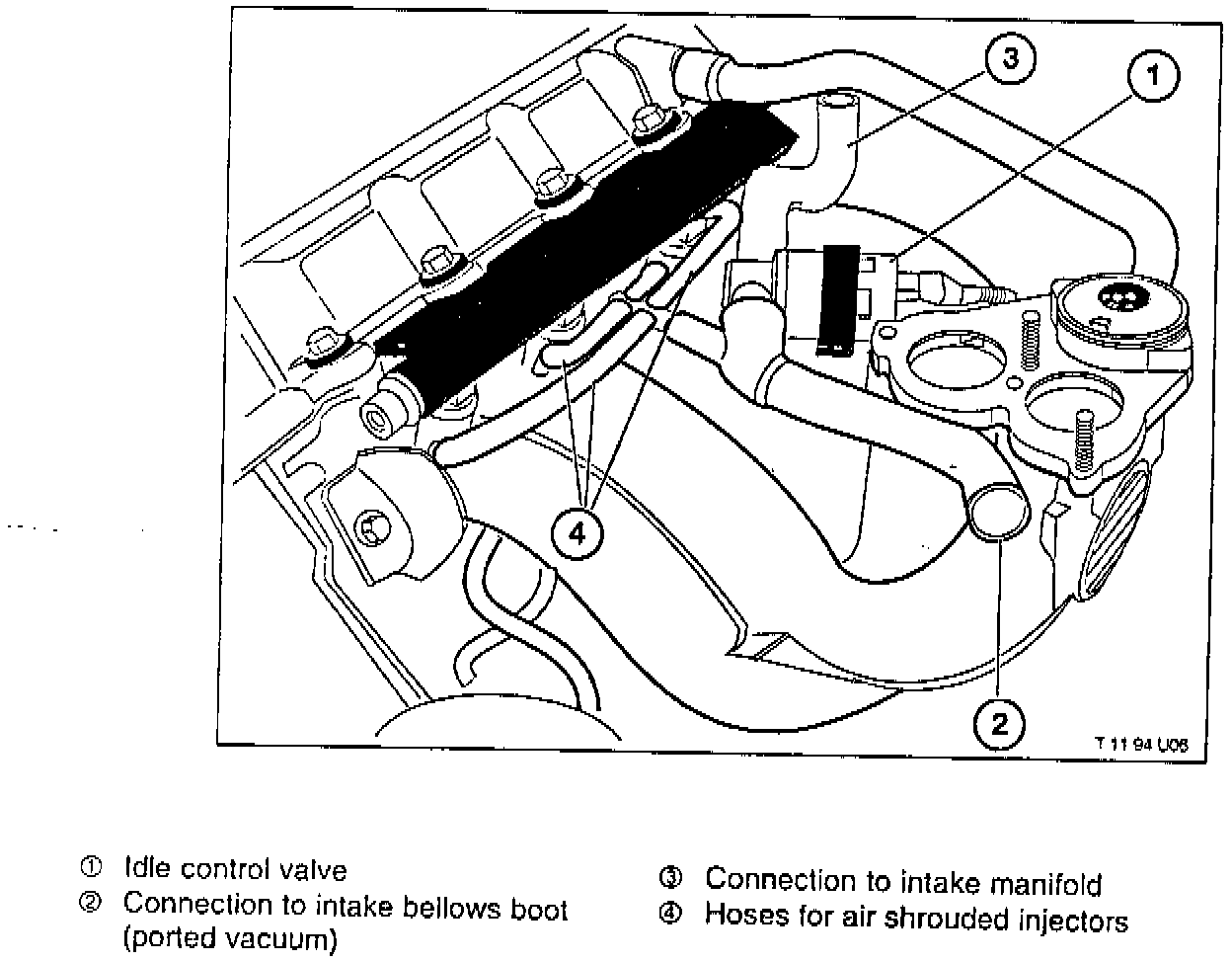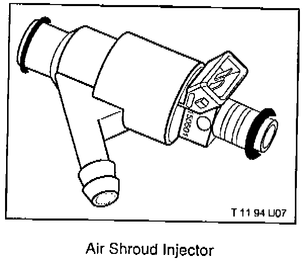 The air shrouded injectors incorporate a hose fitting on the outer injector body which connects each injector, via a rubber hose, to the new idle control valve molded hose, located under the intake manifold. The gap between the inner and outer body of the fuel injector guides the metered air and allows it to disperse and mix with the injected fuel at the injector tip (improved fuel atomization).