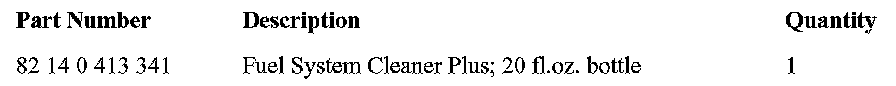 [NEW] If the TOP TIER Detergent Gasoline is unavailable, we recommend BMW Group FUEL SYSTEM CLEANER PLUS (PN 82 14 0 413 341) be added to the gas tank. For optimum cleaning and deposits control, add a 20 fl. oz. bottle every 3,000 miles when refueling.