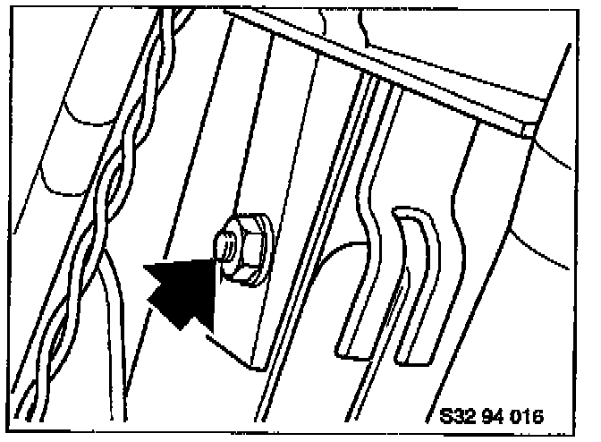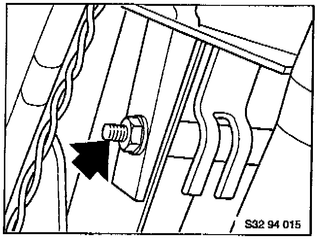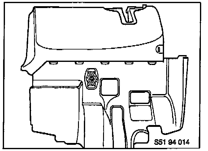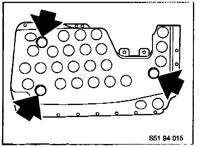 Remove knee bolster and unfasten lower left air duct. (Screw locations indicated)