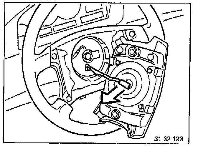 Center steering, remove attachment bolt, and mark spindle and wheel. Remove steering wheel.