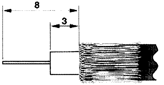 - Carefully and with precision, strip insulation from antenna cable as illustrated (lengths given in mm). Brush shield (copper braid) towards rear. No more copper wire should be protruding in the direction of the inner conductor on the inner conductor insulation (danger of shorting).