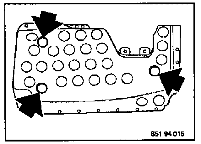 Remove knee bolster and unfasten lower left air duct. (Screw locations indicated.)