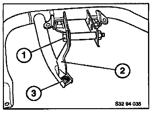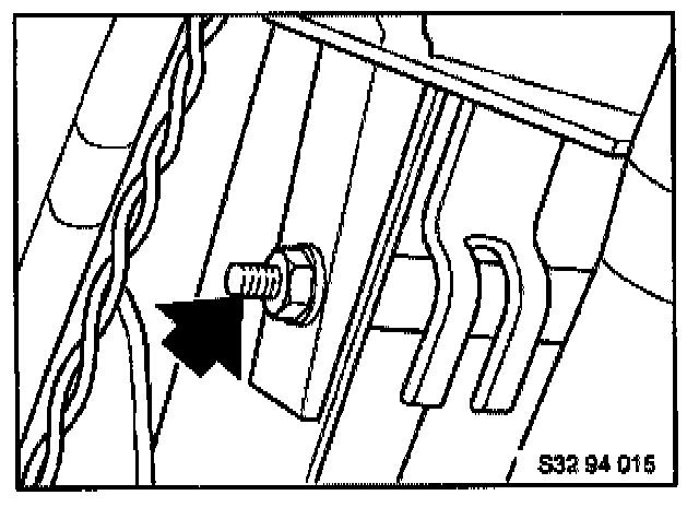 Install the reinforcement bracket (2) for the driver's side inboard knee bolster mount under the head of the bolt (1) as shown. (The view is from forward and above, to better show the proper position.) Tighten new bolt from parts kit to 21.4 Nm. The bracket must rest above square nut (3).