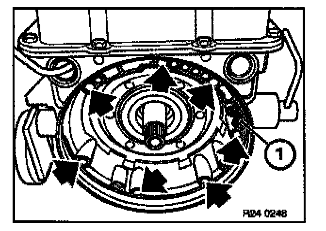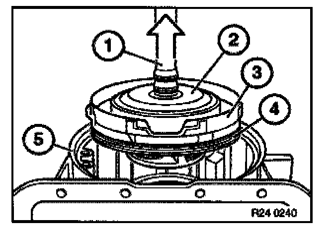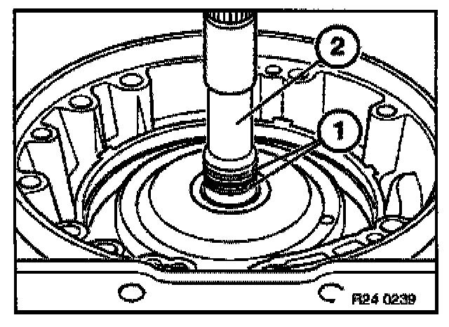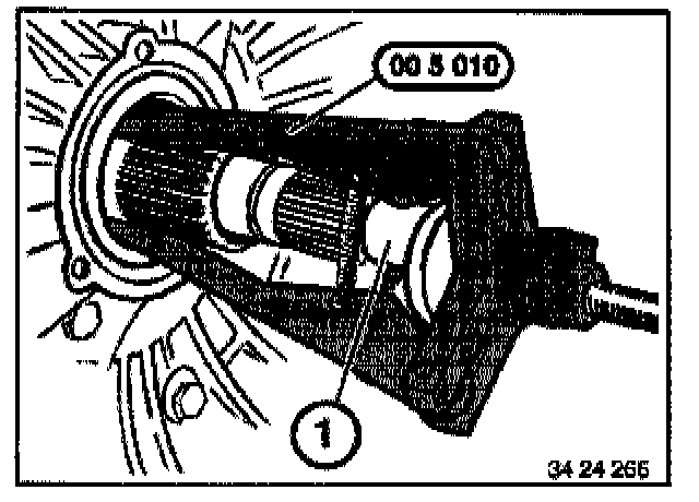 Using special tool 00 5 010 in conjunction with a suitable pressure piece (1), pull radial seal out of converter bell housing.
