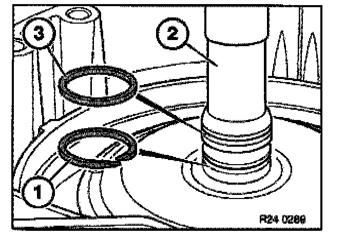 Coat new open rectangular ring (1) with Vaseline and insert in lower groove in turbine shaft (2).