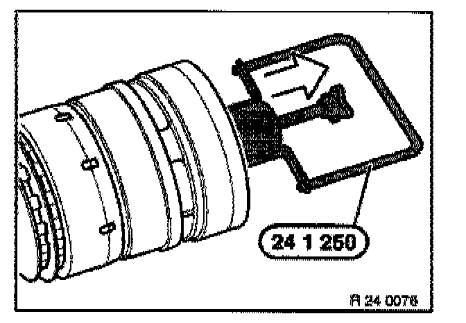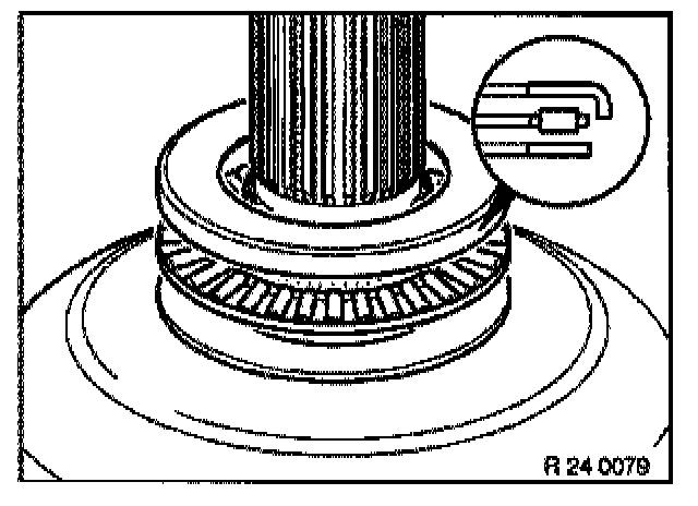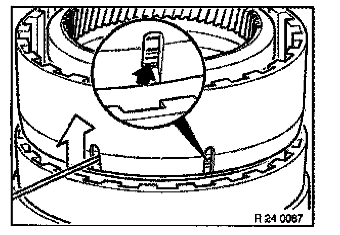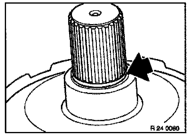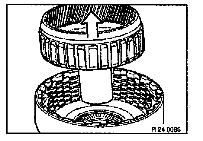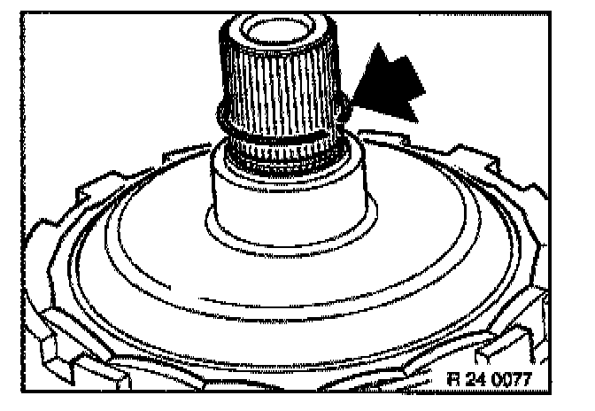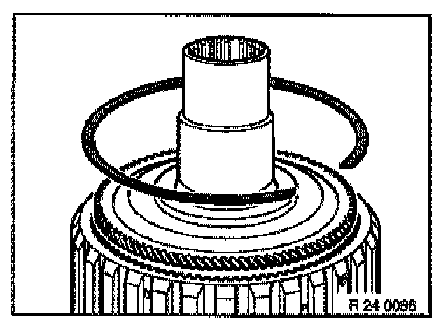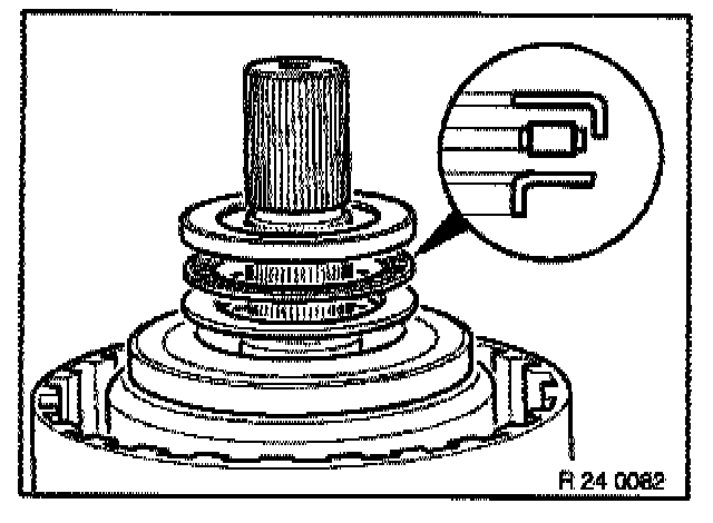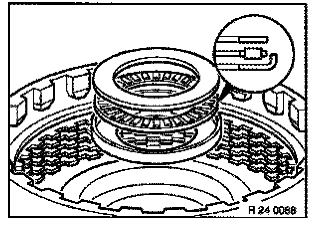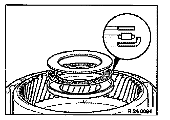 Attach thrust bearing to parking interlock with grease. The thrust bearing is centered if the groove for the locking ring is visible with the parking interlock gear installed.