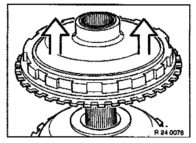 Insert ring gear in input clutch "F" and move gently to and from until all discs engage in one another.