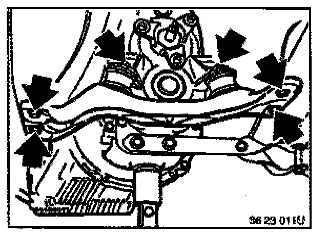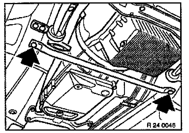 - Support transmission with a workshop hoist. Unfasten screws and remove cross member with rubber mount.