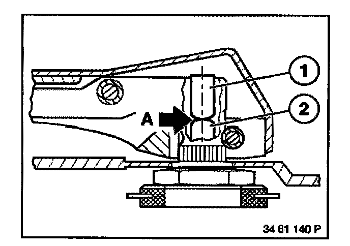 On vehicles with contact pressure adjustment, with the ignition switched off and the wiper blade fitted, clearance between the adjusting screw (1) and the tappet (2) must be