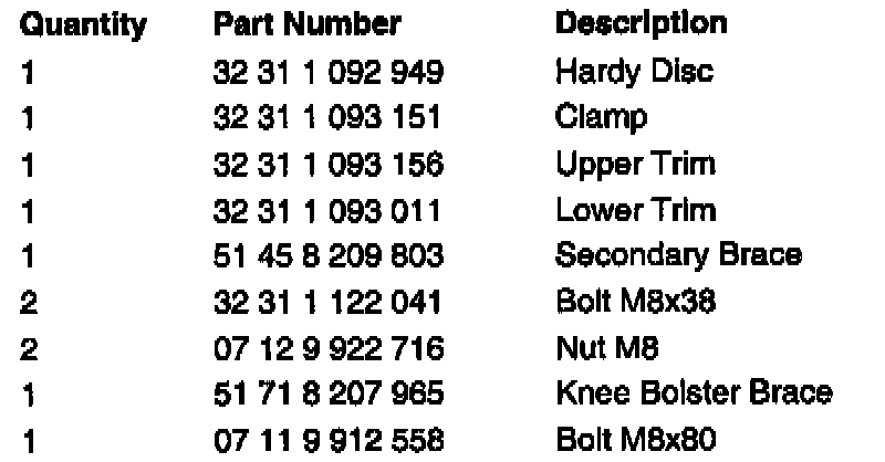 All affected vehicles will receive a new Hardy disc (Procedure 1), new knee bolster reinforcement brackets (Procedure 2), a modification to the ignition switch housing, and new steering column trim (Procedure 3), a modification of the steering column support tube bracket, (Procedure 4), and recoding of the ZAE airbag control module (Procedure 5, 1994 model year vehicles only).