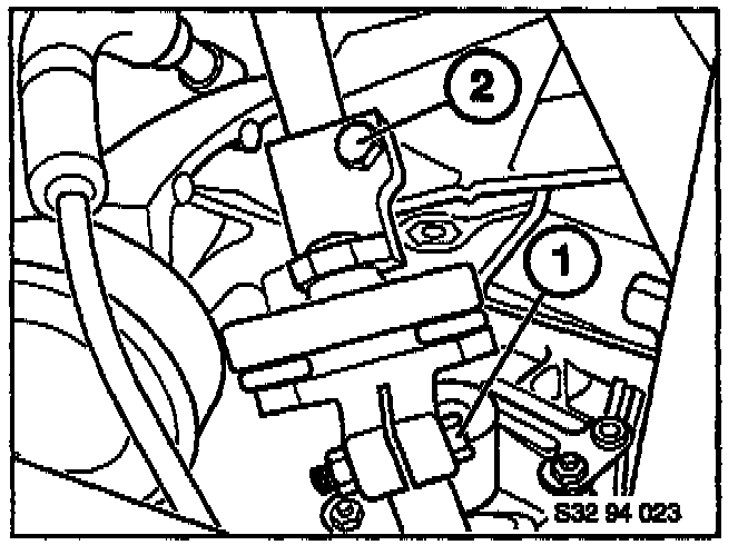 Center the bolt holes in position and install the locking bolts with new nuts in the steering rack clamp (1) and lower spindle clamp (2). Tighten to 19 Nm.
