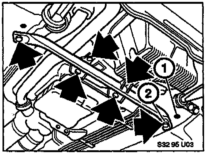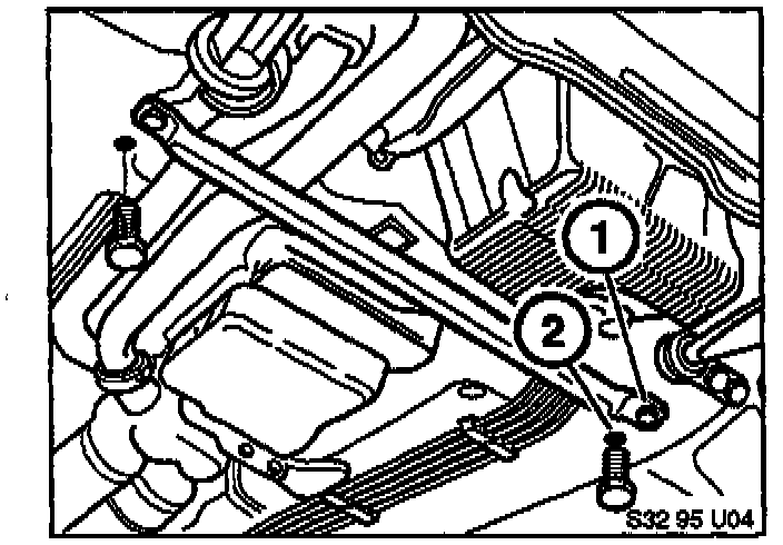 Remove body cross brace and bracket from bell housing, and discard. The brace being removed is mounted in the rear body mounting holes (2), and the new brace will be mounted in the forward holes (1).