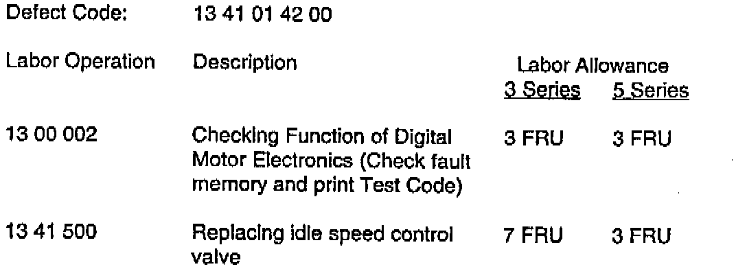 If a vehicle with engine control module fault code 12 (M50) or fault code 73 (M50TU) and transmission control module fault code 105 (only on automatic transmission vehicles) is encountered and the throttle position sensor and its circuit have tested good, and no other outside influence can be found, the idle speed control valve is to be replaced. Other outside influences may include, but are not limited to, the floormat pushed up against the gas pedal, a misadjusted throttle cable, or a misadjusted cruise control actuator assembly.