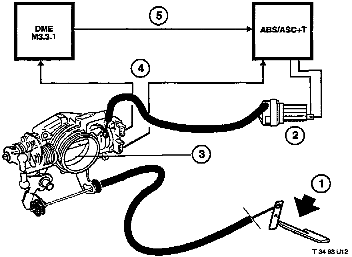 In addition to the ADS position of the throttle, the ASC+T control module also receives the DKI signal (5) from the DME as a plausibility input.