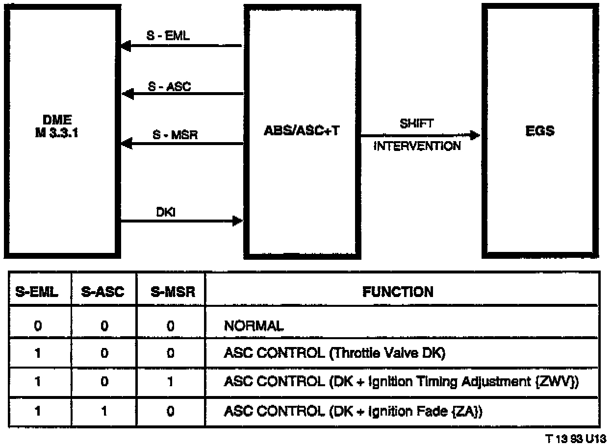 The signals between the ASC+T control module and the DME control module for slip control regulation are switched high/low signals. In addition to the DKI signal the ASC+T interfaces with the DME over three signal paths.
