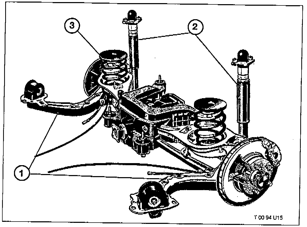 The rear suspension incorporates reinforced trailing arms (1), recalibrated shock absorbers (2) and firmer/larger diameter springs (3).