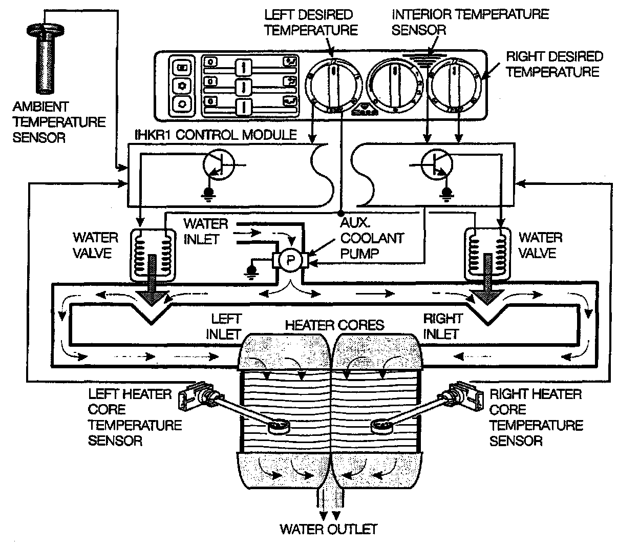 The control module regulates heater core temperatures by controlling coolant flow through the cores.
