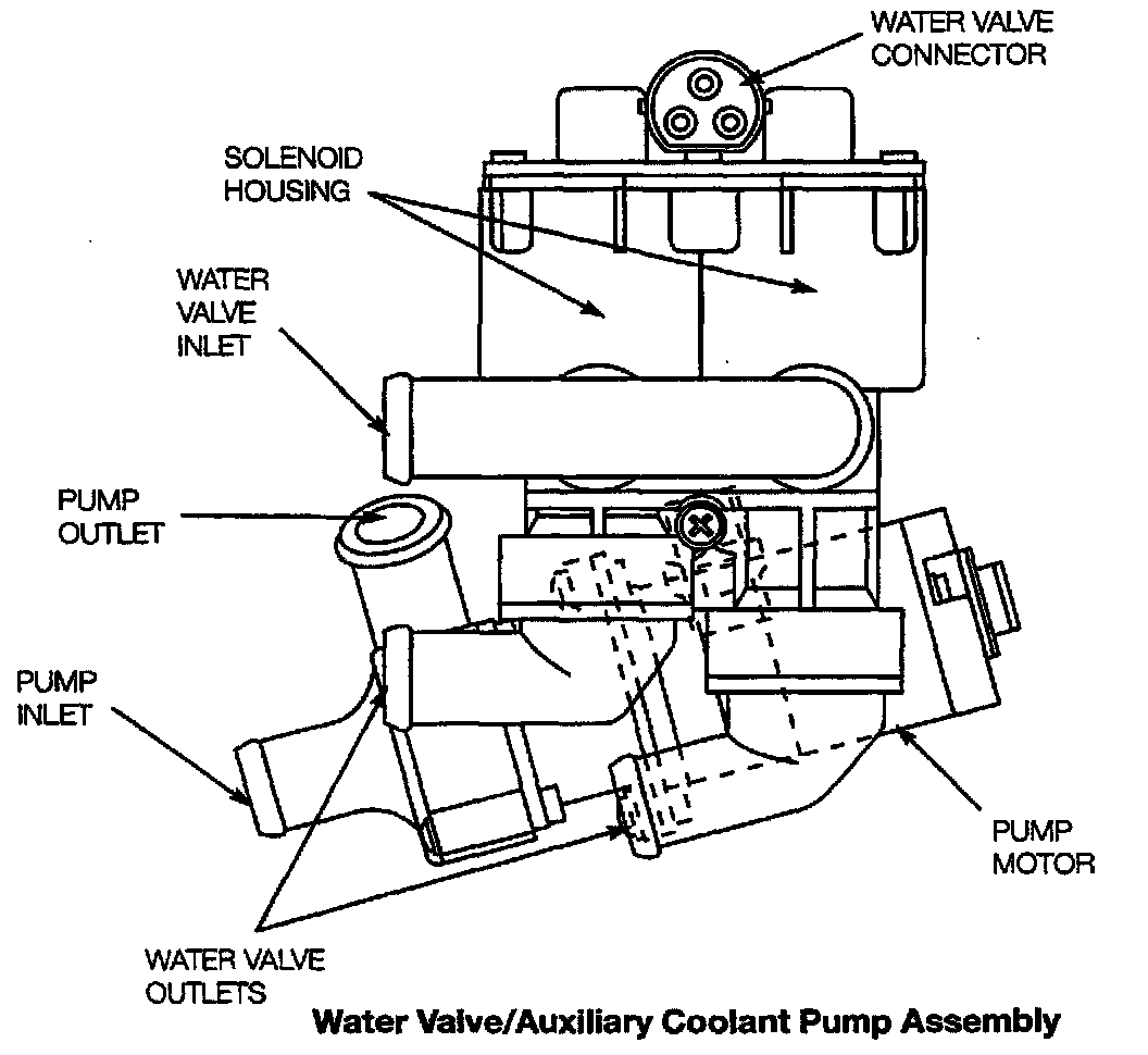 An electrically powered auxiliary coolant pump, positioned ahead of the solenoid valves, is operated by the control module to assure adequate coolant flow to the heater cores when cabin heating is a priority. The pump capacity is about 250 gallons per hour.
