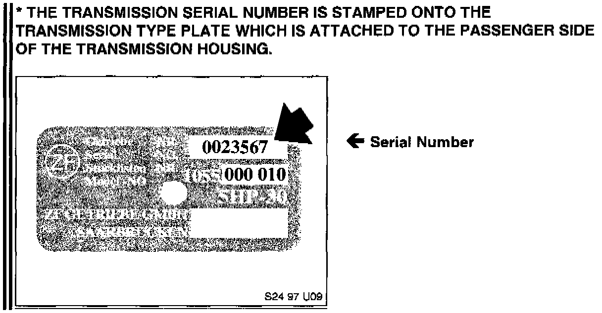 ^ THE TRANSMISSION SERIAL NUMBER IS STAMPED ONTO THE TRANSMISSION TYPE PLATE WHICH IS ATTACHED TO THE PASSENGER SIDE OF THE TRANSMISSION HOUSING.