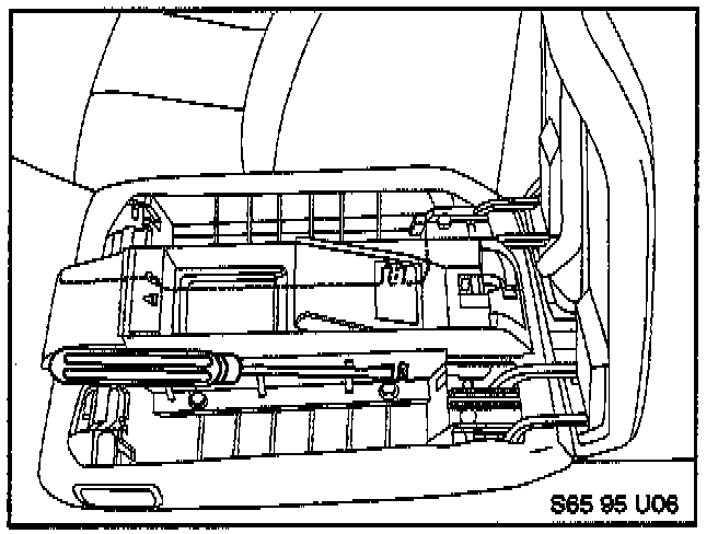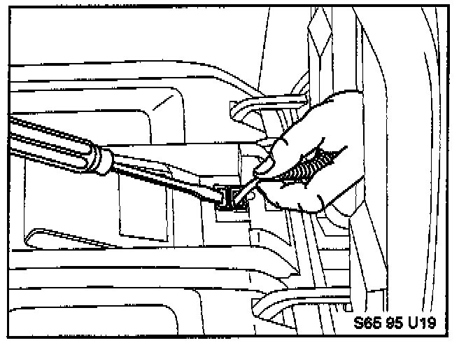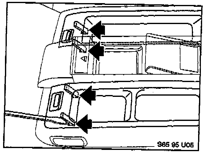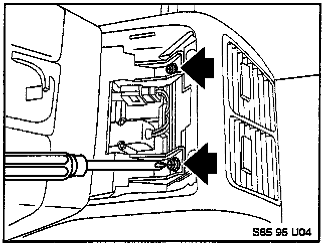3. Using a thin screwdriver, release the locking tabs under each armrest tray as shown. Be careful not to damage the leather or break the tabs. Remove the trays.