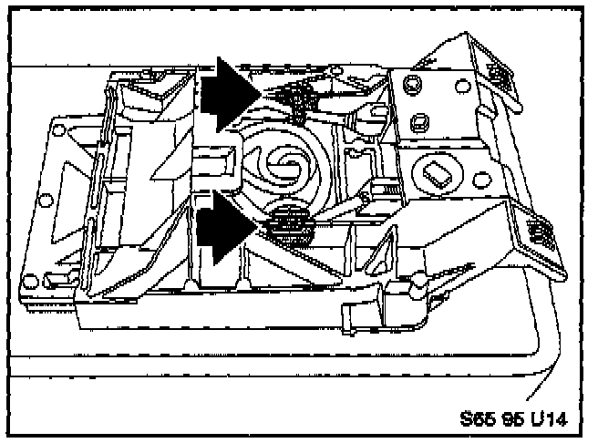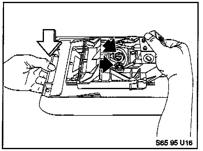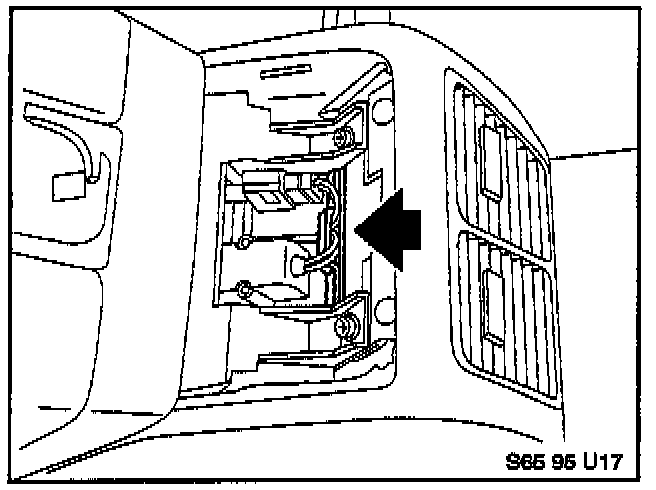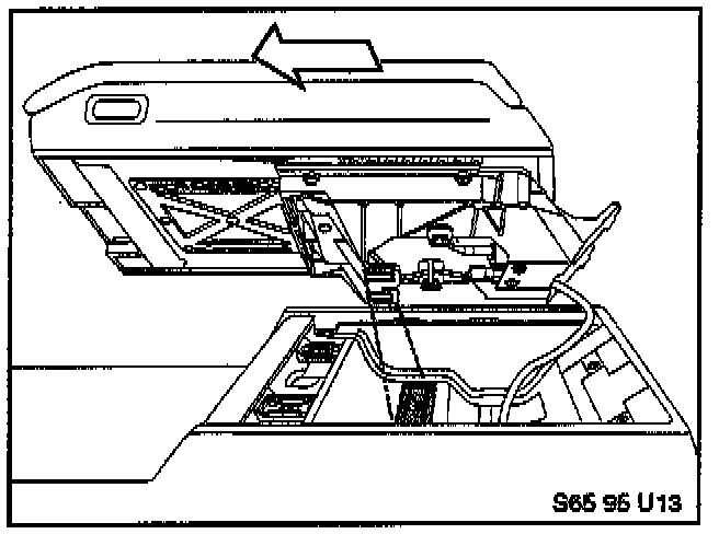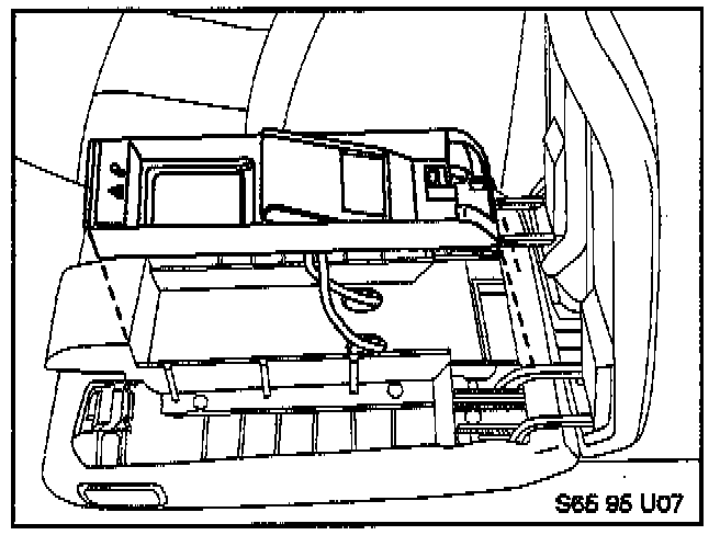 19. Reassemble the Eject Box and all armrest components in reverse order of disassembly. Make sure that the Eject Box wiring is routed through the channel in the rear of the armrest carrier as shown. Turn the ignition and lights on. Check to make sure that the two symbols at the front of the Eject Box illuminate with the lights on. If not, the ribbon connector (see step 14 above) may have been damaged. Turn the lights off.