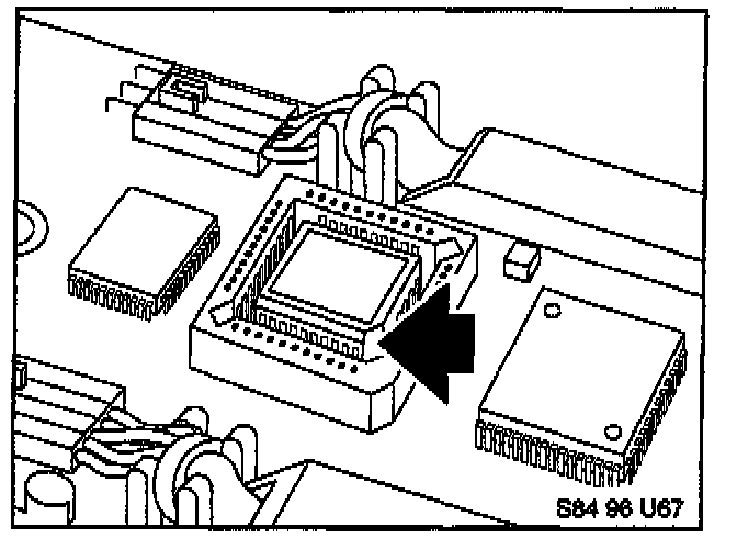 16. Insert the new EPROM into the socket by pressing straight down on the center of the part. Pay close attention to the orientation of the "cut-off" corner of the EPROM as shown so that the EPROM is correctly positioned in the socket. The metal pins of the EPROM must be on the bottom side when inserted into the socket. The label "HW03/SW07" or "HW03/SW06" must be on top.