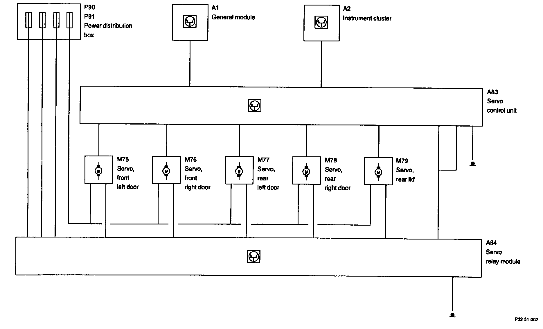 The relay module (RM) contains the relays for the turn-catch lock drives. All relays in the relay module are monitored for defects by means of diagnostic feedback (diagnostic links) to the control modules. A defect code is stored in the defect code memory when a defect is detected.