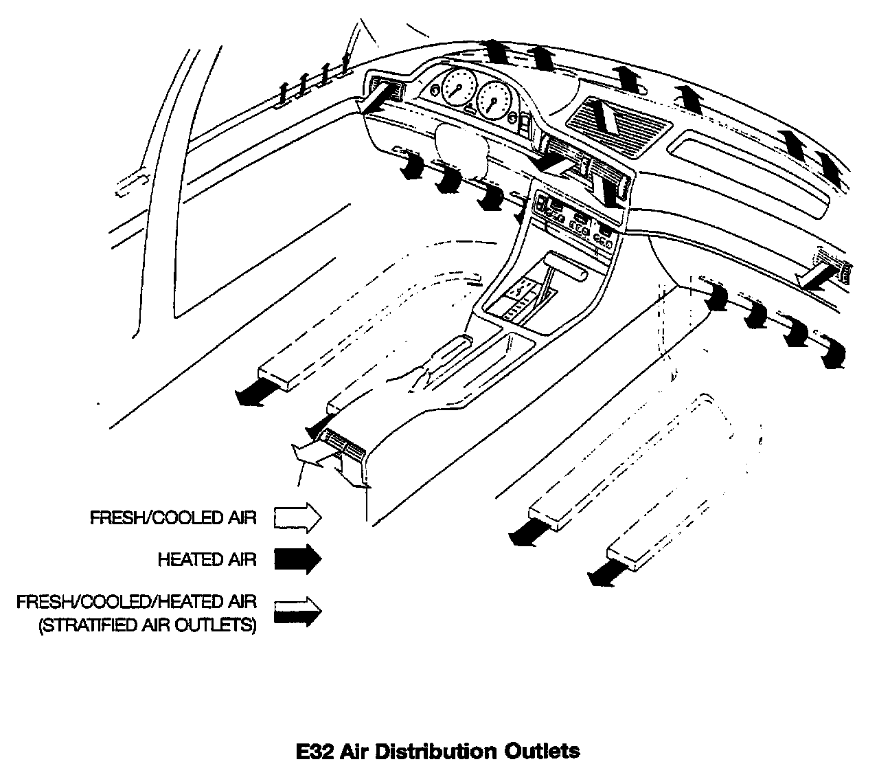 IHKA E32 air distribution outlet locations are shown above. On IHKA E32 systems, stepper motors are used to control all air distribution flaps.