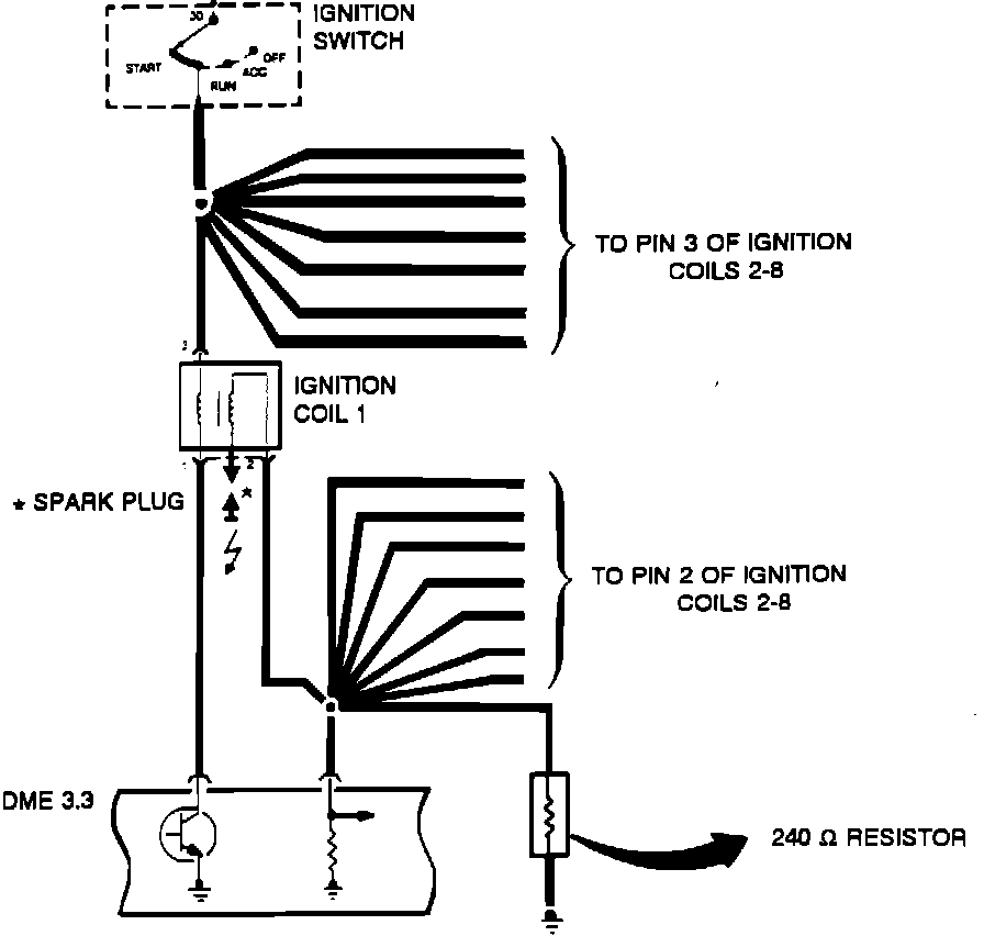 The shunt is a 240 ohm resistor in the common secondary ground lead of the ignition coils. If primary ignition circuit monitoring is recognized as OK, but secondary ignition voltage is not reached, the coresponding injector output stage is switched off.