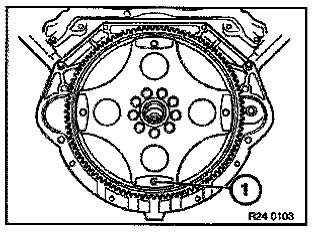 - Bore (1) in drive plate must be accessible from aperture in oil pan.