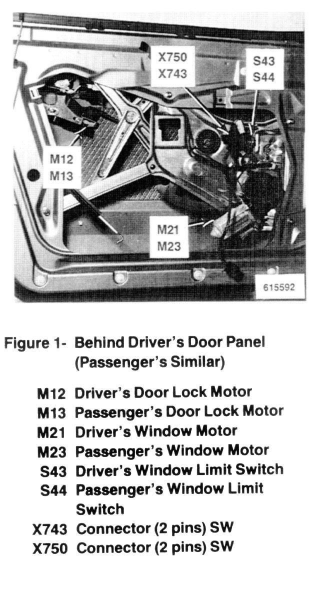 Component/Connector Location Views: Behind Driver's Door Panel (Passenger's Similar):